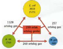 Koonin ve ekibi, H. influenzae, M. genita-lium tüm genom dizilimini o zaman için bilinen E.coli genleriyle ortolog olan genleri bulmak için karşılaştırdıklarında %75'i bilinen E. coli genleri içinde H.influenzae'nın genlerinin %70'ine ait ortologlar bulunmuş. Filogenetik olarak çok daha uzak olan M. genitalium genlerinin de büyük bölümünün (her üç bakteri için ortak bir gen takımı dahil) H. influenzae ve E. coli genleri arasında ortologları vardı.