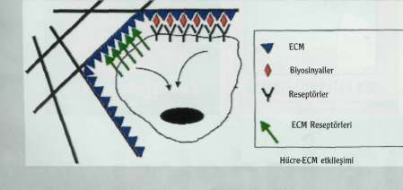 Bilindiği gibi vücudumuzdaki doku ve organlar; canlı hücreler ve bunları birara-da tutan "hücre dışı matris" (extracellular matrix, kısaca ECM)'ten oluşuyorlar. ECM karmaşık yapı ve işleve sahip bir iskelet gibi düşünülebilir. Bileşimi, doku ve organların özellik ve işlevine göre değişiyor. Örneğin, kemiğin sertliğini ve uzamasını etkilerken, kıkırdağın direncini, kan damarlarının basınca dayanımını ve esnekliğini, derimizin elastikliğini ayarlıyor. ECM'in bir diğer önemli rolü de, hücre üremesi, gelişmesi ve yara iyileşmesi sırasında, çözünebilen yapıdaki sinyal moleküllerini salması. Çünkü ECM, bu sinyal moleküller için bir depo oluşturuyor. "Büyüme faktörleri" olarak da bilinen bu moleküller büyüme, farklılaşma, salgılama ve ölüm gibi çeşitli hücresel işlevleri düzenliyorlar. Her biyosinyal, hücre yüzeyinde bulunan ve yalnızca o faktörü tanıyan bir almaca (reseptör) sahip. Biyosinyaller bu almaca bağlanarak hücresel işlevleri etkinleştirmeye başlıyorlar. Ancak, sinyal molekülleriyle hücre arasındaki etkileşimin mekanizması henüz tam olarak anlaşılamamış.